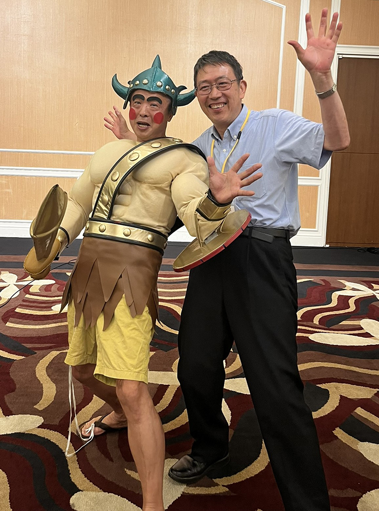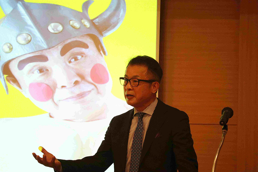 その後、久貝副会長の司会の元、懇親会に移りました。駆けつけていただいた門川大作立命館大学校友会長の乾杯のご発声の直後、会場にはのぶちゃんマンが乱入、のぶちゃんマンのテーマを熱唱していただきました。